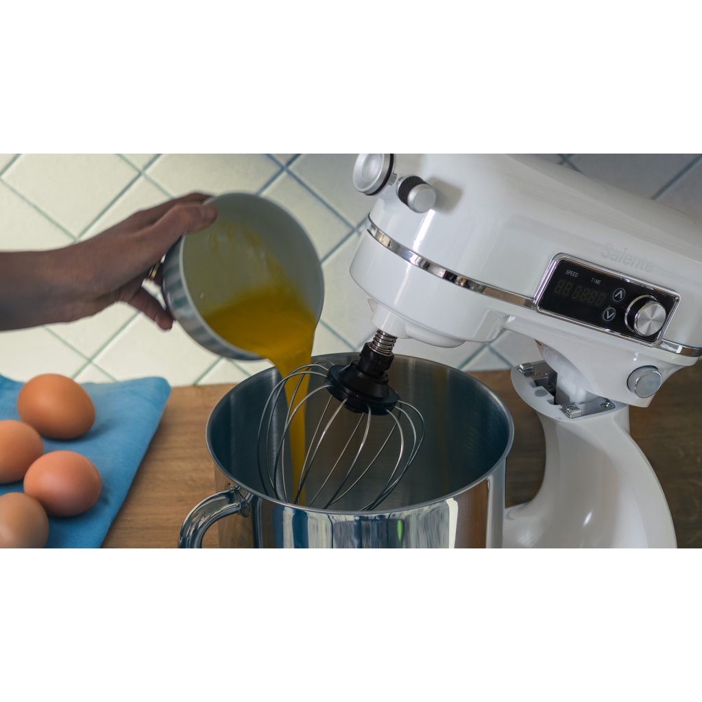 Šľahacia balónová metla dokáže vyšľahať bielky do takej pevnosti, že môžete pokojne otočiť misu hore dnom – a bielky sa ani nepohnú. Perfektne našľahaná šľahačka či krémový puding? Hotovo behom chvíľky! Ultralehká hliníková miešacia metla zase s ľahkosťou zvládne piškótové cestá na torty či palacinky a hustejšie nátierky. Špeciálne tvarovaný hnetací hák hravo spracuje hutné cestá na pizzu či chlieb, ale aj domáce rožky, chrumkavé žemle alebo vláčne briošky na burgery. Taktiež vám už tečú slinky?