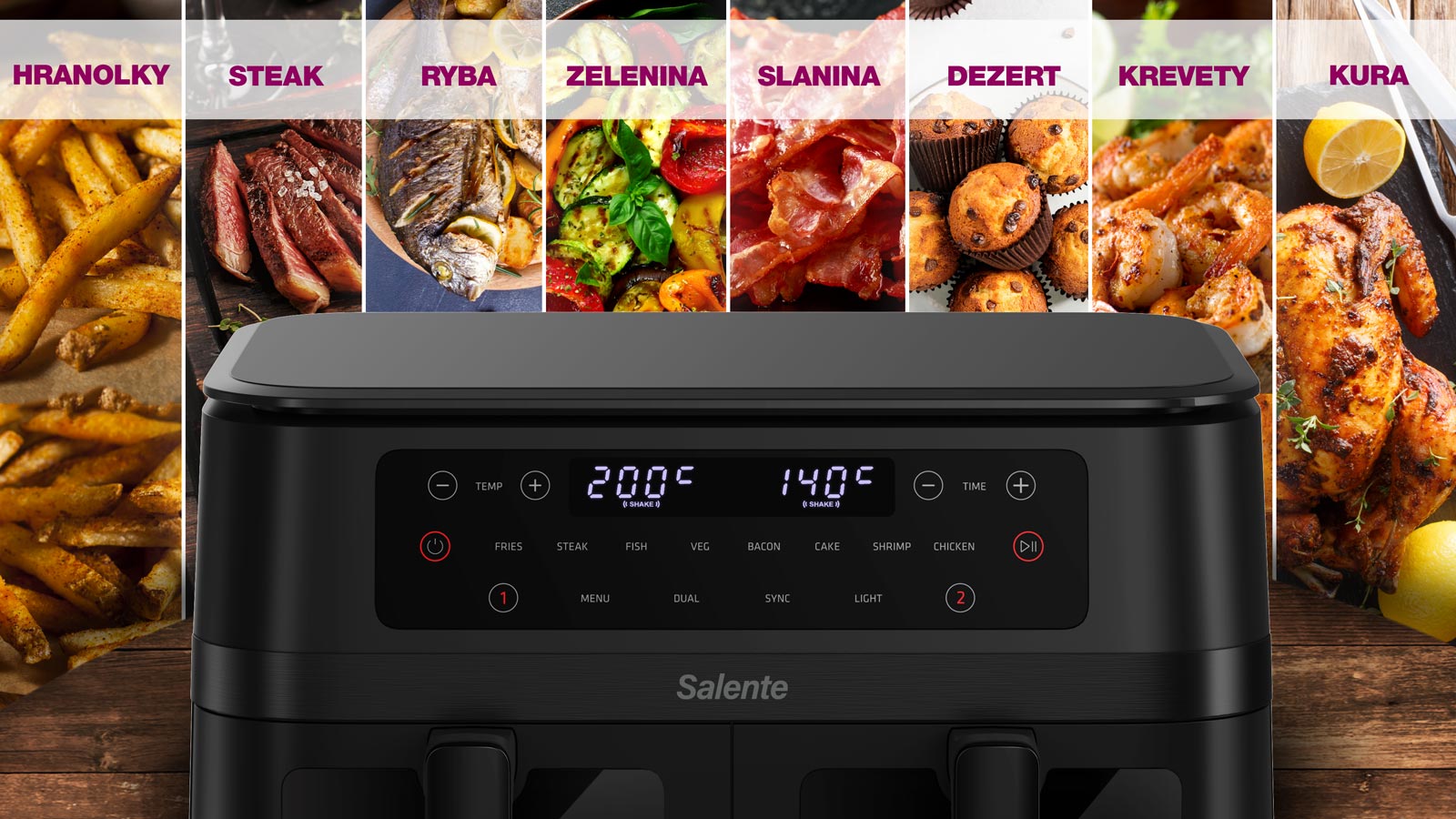 K tomu, aby ste v horkovzdušnej fritovnici pripravili neodolateľné pochúťky, nemusíte byť skúsenými šéfkuchármi. Salente DoubleAir totiž ponúka 8 prednastaven programov, ktoré vás zbavia všetkých zložitostí – jednoducho si vyberiete typ pokrmu a prístroj všetko nastaví, ako je treba. K dispozícii máte programy na hranolčeky, steak, rybu, zeleninu, slaninu, dezerty, krevety a kura.